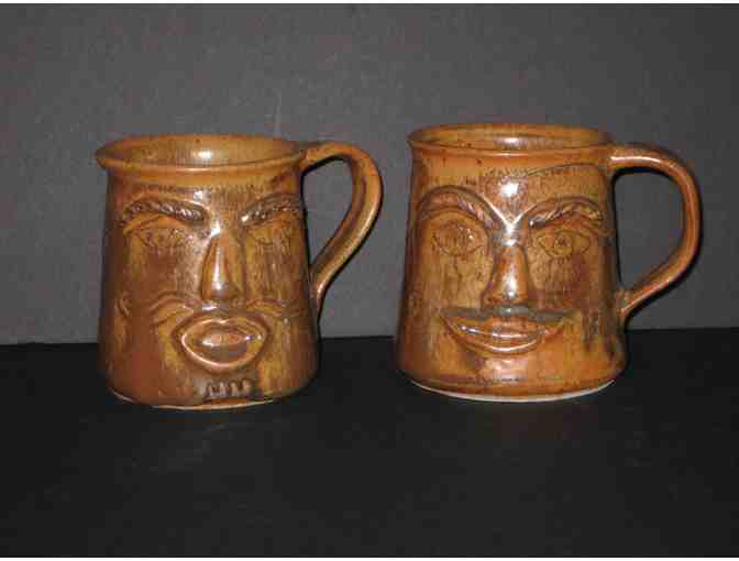 Enjoy your favorite beverage in these handsome "his and hers" face mugs. These beautifully handcrafted 16-oz. mugs were created by a Cleveland Heights ceramics artist. In gorgeous earthy tones of tan and brown, these engaging mugs are great for hot or cold beverages any time! Bid high and often on this pair of winsome face mugs and brighten each day with a smile.
