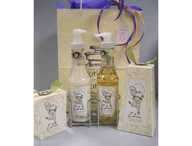 This beautiful set of skin-care products includes pump bottles of hand wash and hand lotion in a caddy, soap, and scrub, all from the "Eden" collection.