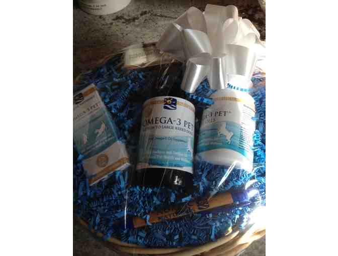 This basket is filled to the brim with Omega-3 Pet Fish Oils! You will get 2 fluid ounces of cat or small breed Omega-3 Pet oil suppliment; 8-ounces Omega-3 pet oil suppliment for medium to large dogs; 60 Omega-3 pet fish oil capsules; a Nordic Naturals pen and a Nordic Naturals pill container so you can take your pets Omega-3 capsules with you when you travel!