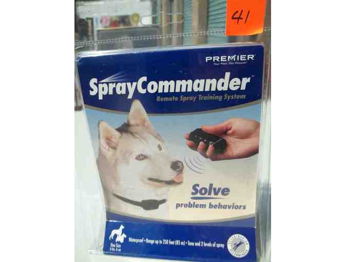 "Spray Commander" from Premier is a remote spray training system that you can use as a deterrent tool to train your dog and hopefully solve behavior problems. For dogs over 6 pounds. Should preferably be used under supervision of a trainer, who can instruct you in using it correctly.