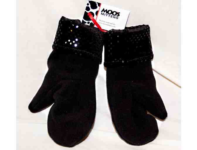 Moo´s Mittens are constructed of two layers of fleece for extra warmth and comfort. Each mitten is made with eight individual pieces. Cuffs are of high quality. Decorative stretch velvets dress them up so you can enjoy warm, cozy hands at any occasion. These sparkly mittens are perfect for the fun-loving, dramatic diva. Fits medium to large hands. Made by Kathy Boselli of MOO'S Mittens in Bedford, NH.