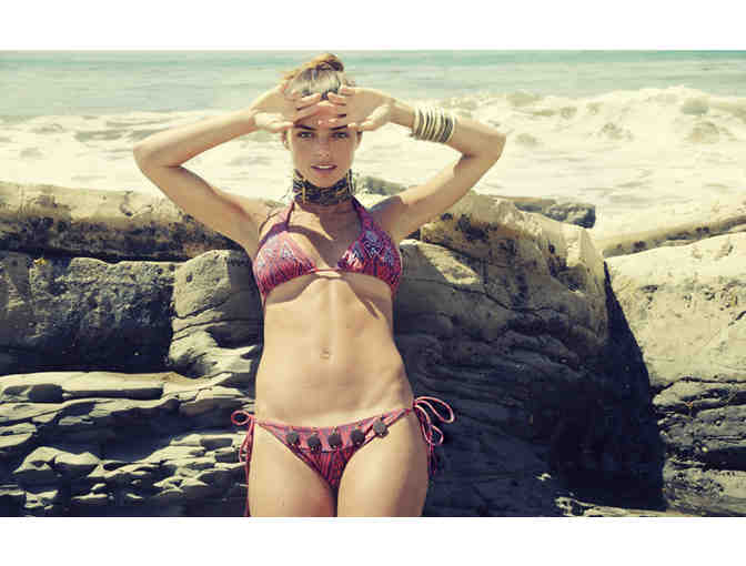 The winning bidder will recieve a red and purple bikini with wood trim in size large. Please see La Isla's size chart in the 'picture' section above.
