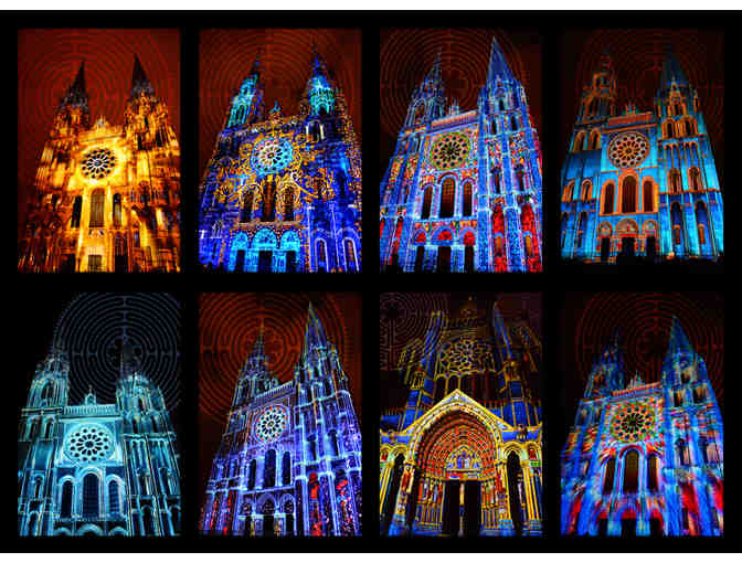 Set of eight different images from the annual Chartres Festival of Lights with the labyrinth added in the background on blank cards with envelopes.