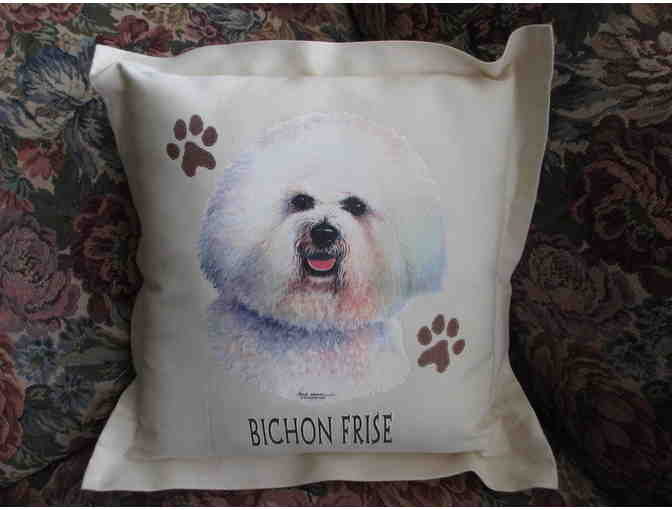 Every chair or sofa needs at least one decorator pillow for character and style! Take this one, a 12" by 12" square pillow with a happy Bichon applied to the front. There is an additional 1" canvas border around the pillow.