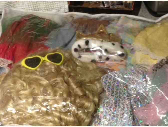 The 6 costumes are mostly handmade and will fit a basset girl around 50 pounds! There is a Christmas gown; a yellow gown, a disco gown and 3 others. There is also a pair of sunglasses, a blonde wig and a crown! A must have for anyone attending any costume contests with their hound!