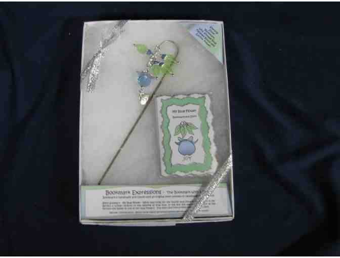 Sterling silver bookmark with vintage blue faceted beads and lucite flower along with stories typed on handmade cards with modified vector graphics. At least one object or character from the story is incorporated into the bookmark. Stories vary from original tales, adapted folktales, myths and legends to historical tales.