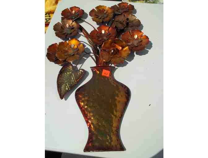 This metal wall hanging is of a vase of flowers