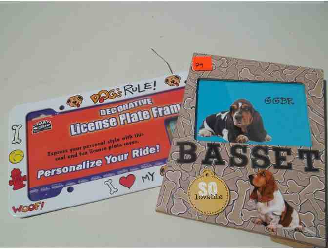 With this set you get 1-basset hound "so loveable" photo frame and a "Dogs Rule" license plate frame