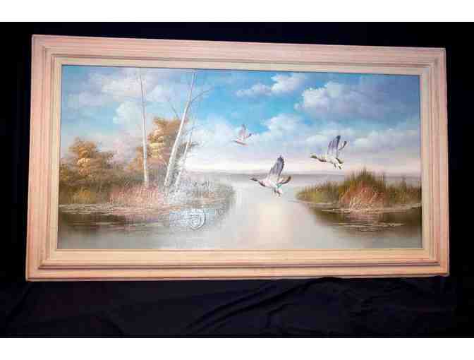 This framed oil on canvas painting measuring 56" x 31" will bring beauty to any large wall. The ducks taking flight give the sense that fall is upon them and winter is coming. The painting is signed.
