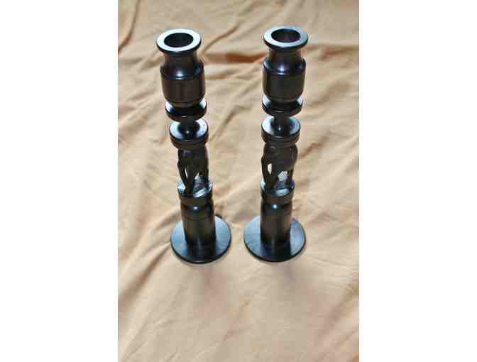 This beautiful pair of ebony candlesticks features a pair of styled handcarved elephants. One of a kind Tanzanian art. Please bid generously!