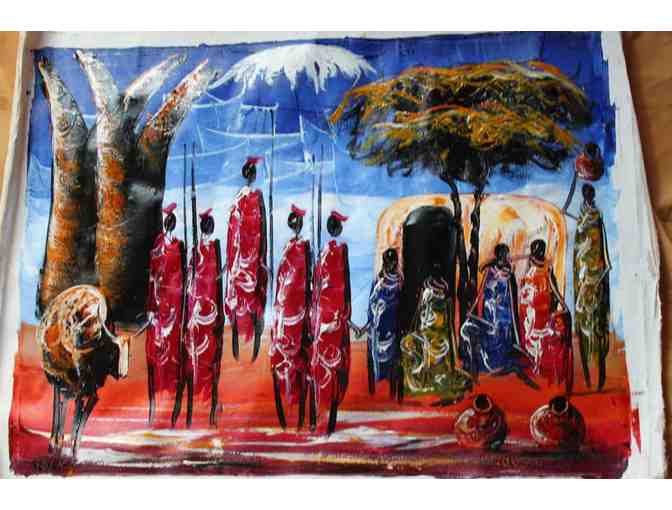 This beautiful painting shows the traditional style of the Maasai tribesmen, who still tend their cattle all around northern Tanzania. In fact, we have several Maasai children in the orphanage. One of a kind Tanzanian art. Will be shipped unstretched. Please bid generously!