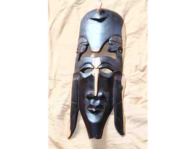 This beautiful handcarved ebony mask incorporates many traditional Maasai craft motifs, including their practice of reshaping the ears. This item was unfortunately cracked in transit but has been repaired, so is available at a great price. Approximately 20 inches tall by 10 inches wide. One of a kind Tanzanian art! Please bid generously!