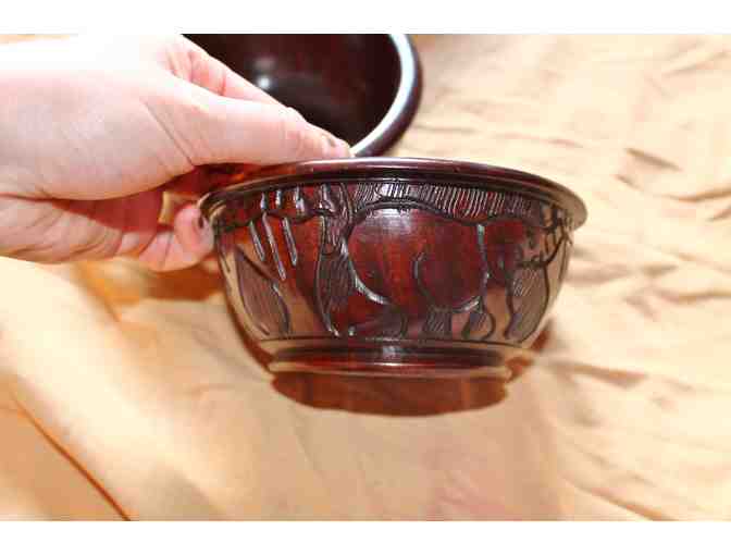 This beautiful set of three hand carved rosewood bowls features majestic elephants, the fast vanishing symbol of African wildlife. One of a kind Tanzanian art. Please bid generously!