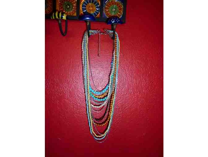 Fifteen strands of colorful beads and silver ranging from 15" to 27" long. So fun to wear!