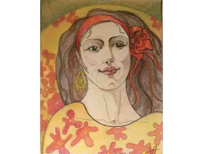 Elena Gutman used a mixture of pastel, pen and watercolor to create this energetic portrayal reminiscent of a joyful dancing Gypsy woman. Framed 17” x 13”