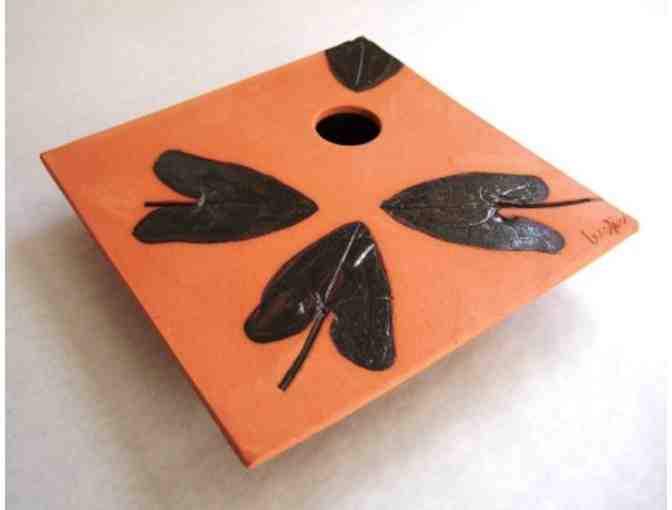 Ikebana vase, terra cotta clay, suitable for wet or dry flower arrangements. Measures approximately 8" square and sits 1.5" tall.