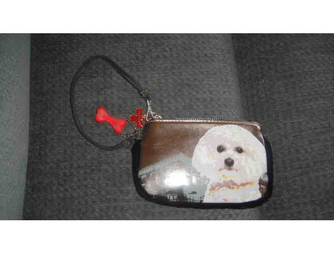 Bichon Frise on a silver background. Back of wristlet is black. "Bone" charm attached.Measures 6" x 4"