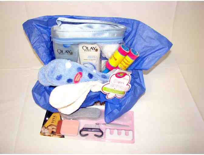 This basket has a wonderful Olay gift collection of 2 body washes (daily purifying with sea salts & microbeads, winter retreat vanilla indugence , 1 bar of ultra moisture, vanilla indulgence and 1 puff). Also enjoy two pair of hydrating therapy socks, mini lint rollers and Viva nail care items.