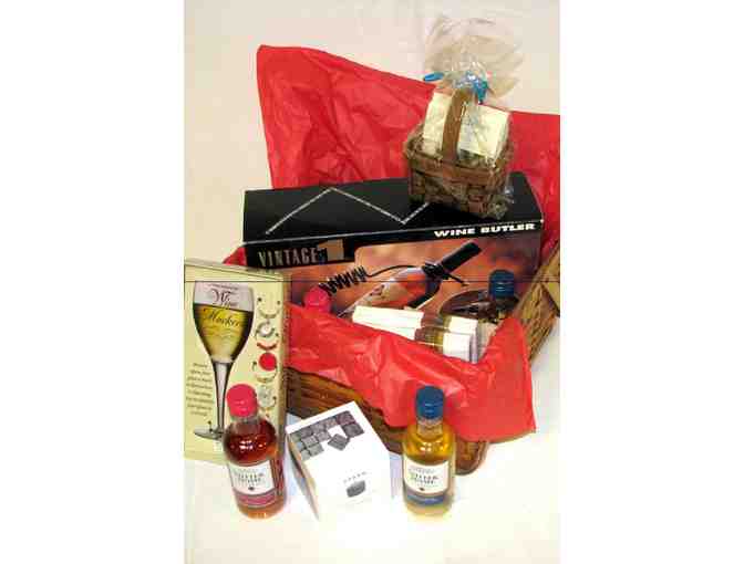 This basket includes a "Vintage 1" wine butler, set of 9 "sparq" soapstone rocks for climate control of your drinks without dilution, 6 wine markers, 50 hors D'Oeuvre picks, dip mixes and cocktail napkins. All you need is the wine! (See item #229!)