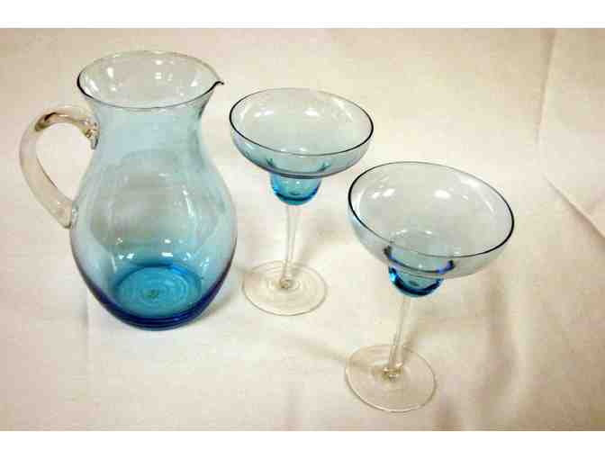 Beautiful Margarita Pitcher with two matching glasses in a vibrant turquoise-blue color. Kick back, take off your shoes and don't forget the salt!