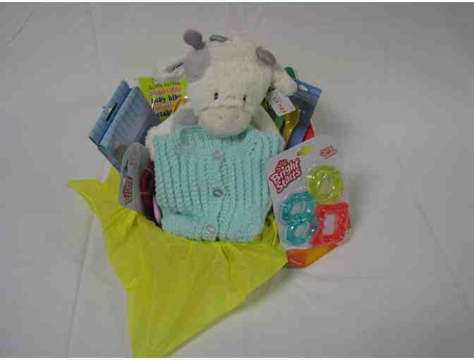 Included is a hand knit sweater and bonnet for an infant, stuffed plush cow by Baby Gund, Goodnight Moon, cloth bib and disposable bibs for travel, soft plastic spoons, teething rings, wall plaques and baby's rattle.