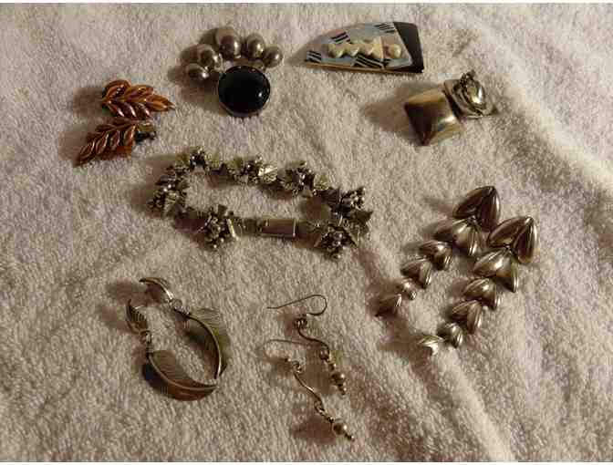 5 sets of earrings, bracelet, and a couple of brooches or pendants.