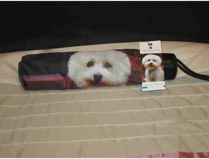 This is a compact umbrella by "Little Gifts". It measures approximately 10" long when closed and opens up to a 38" to 40" Arc. There are black panels alternating with decorated panels of soft dark red, some green and faint mauve as a background with an adorable bichon in the center of each. Manual open and close. New with tags.