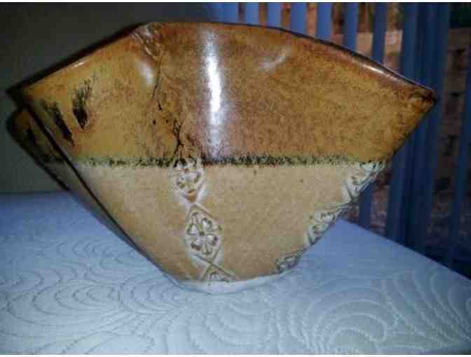 Distinctive bowl in rich earth tones with intricate patterns. A lovely gift or display piece for your home. 10" wide X 6" tall.