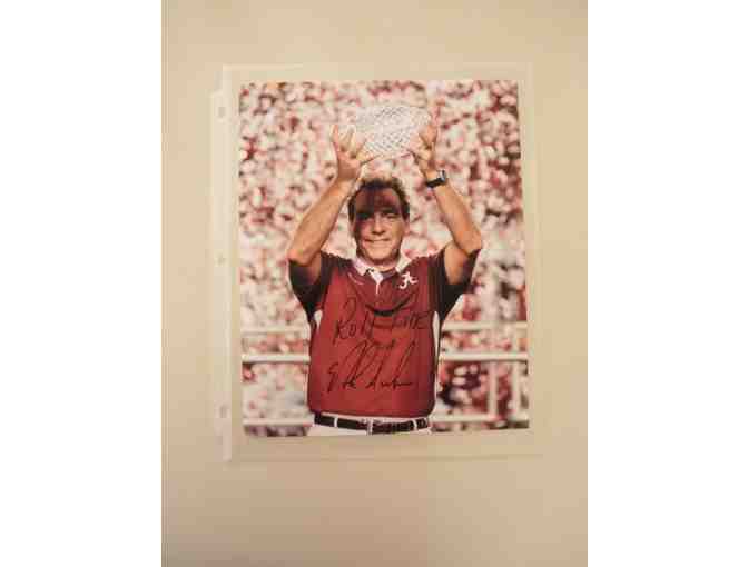Great Photo of Nick Saban holding the Championship Football - AND he's even smiling. This 8 x 10'' print would look Great in your Bama decorated room. Your friends will Never be able to tell that this is a fine print copy and not the originaly signed photo, if you don't tell them ; )