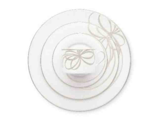 Adorned with a distinctive platinum band and whimsical bow design, this fine white china dinnerware set from Kate Spade will set a tone of easy sophistication for your next dinner party. Take home eight dishwasher-safe dinner settings consisting of a dinner plate, salad plate, bread and butter plate, tea cup, and saucer.