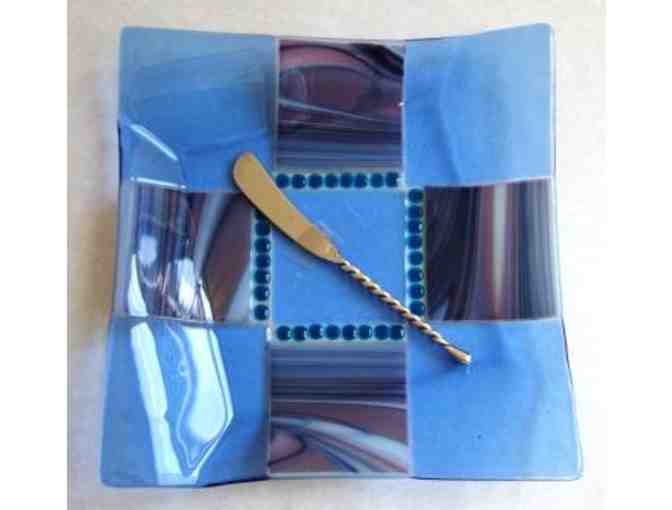 Gorgeous 10" glass, square serving plate. Piece is cut and fused in a kiln. Blue plate with purple squares.