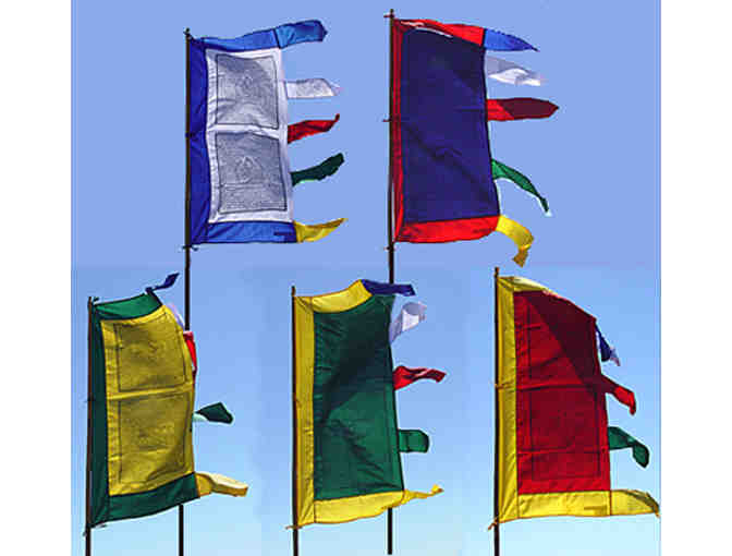 Each of these prayer flags from Radiant Heart bears a different design. The 100% cotton flag is printed two times using the woodblock technique. All edges are hemmed and there are cloth ties along one side for attaching the flags to poles. The five flags are in the colors of the Buddha families: blue, white, red, green, yellow. Along the other side there are five multicolored streamers printed with mantras to enhance the power of the prayers.