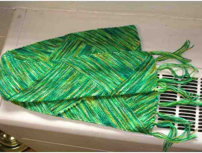 This yarn was purchased on a trip to Seattle! Vivid greens/yellows with a fun diagonal construction. 5"x66" made of 100% superwash Merino (wool). May machine wash on gentle cycle, lay flat to dry.