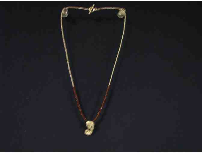 Monte Nikkel, of Hampton, NH, has handcrafted this beautiful and delicate silver pendant with facet garnets, sterling silver delicas and toggle. Necklace is 16" in length.
