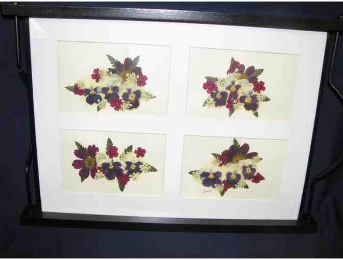 This beautiful recycled tray has been restored by the artist and then carefully decorated with New Hampshire pressed wild flowers beneath a glass top; 16 1/2"L x 11 1/2"W. This item should be kept out of the sunlight.