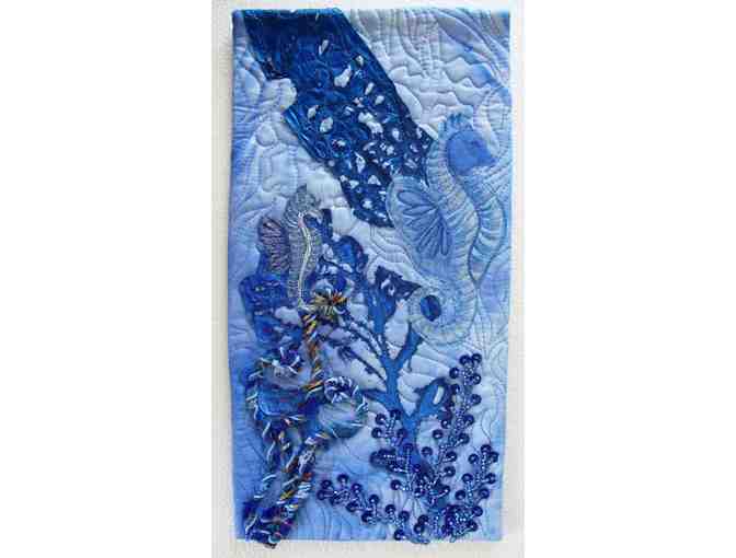 Small art quilt, ready to hang. 6" x 11.5"; free motion quilted, hand beading, threads, burnt tyvek, hand painted transfers.