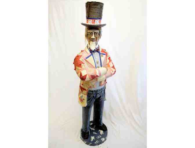 Artist Statement: My Uncle Sam is constructed with antique quilt pieces and other early textiles. An authentic Troy collar and early brass buttons were found at a local antique shop. He wears vintage Wrangler and Lee jeans and boots fashioned from a vintage tie. His mosaic-like face represents the various cultures in the U.S. today. To see photos and more, see www.maryfrancesmillet.com.
