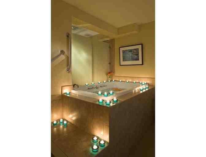 This fabulous romance package option is now available every day of the week. It includes 2 coctails at Saffron, a long stem red rose, unique bath products, dinner for two, and an amaxzing room. The Japanese Hydrotherapy Spa Studio features a chest-deep tub for two and hydrotherapy air massage with aromatherapy diffuser, this is a truly uniue room right down to the rain-shower head.