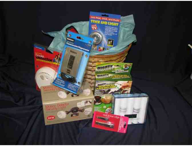 Here is a great basket to give to that man around the house. Lots of goodies to use. A motion detector security light, Holmes indoor/outdoor thermometer, men's cotton handkerchiefs, Family Guard smoke detector, and many more 'necessary' items.