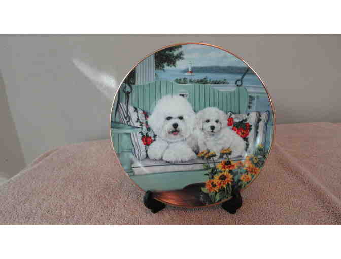 Porcelain Collector Plate from the Danbury Mint collection entitled Bichon Frise. Plate is trimmed in 23 kt gold.