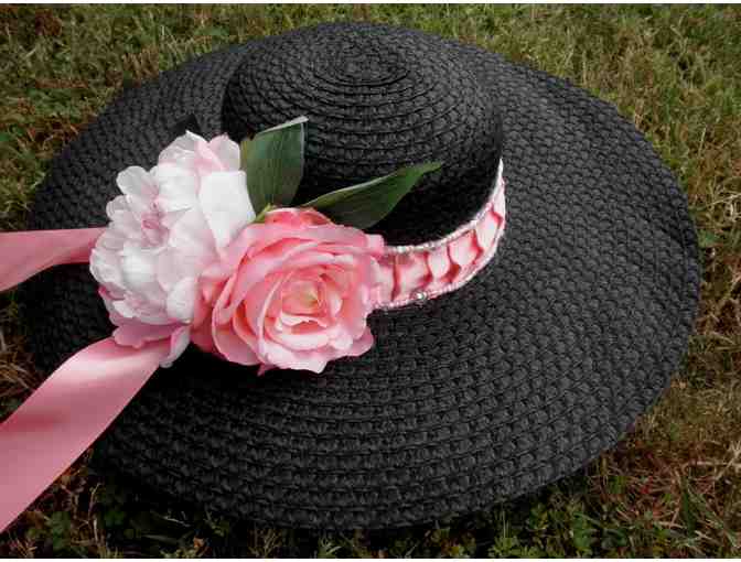 Large 18'' diam. black straw hat with a Pink beaded band and silk flowers. Keep the sun off your face and look beautiful wearing this!