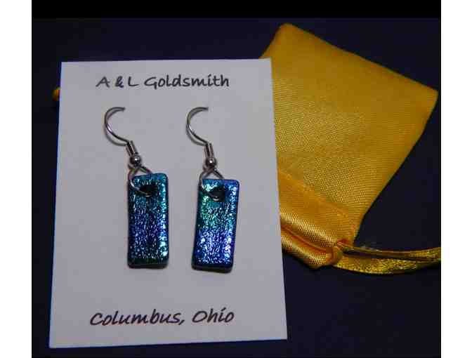 Beautiful one-of-a-kind Dichroic glass earrings. They have a particular transmitted color and a completely different reflected color, as certainwavelengths of light either pass through or are reflected. This causes an array of color to be displayed. The colors shift depending on the angle of view.