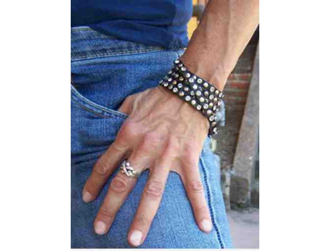 - Soft supple black leather accented with studs, zippers and crystals