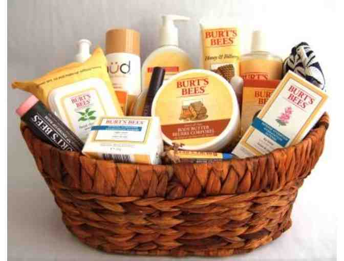An assortment of products from Burt’s Bees, local maker of natural health and beauty products that care for your body from head to toe, in a beautiful woven basket.