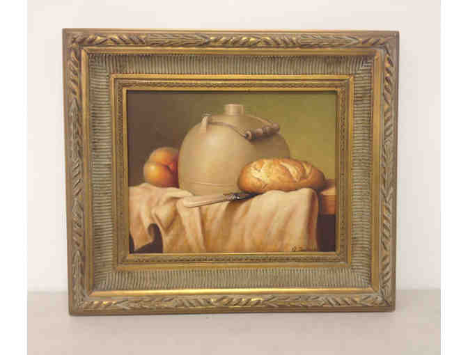 Framed original oil painting on panel entitled "Bread & Peach" (11"x14").