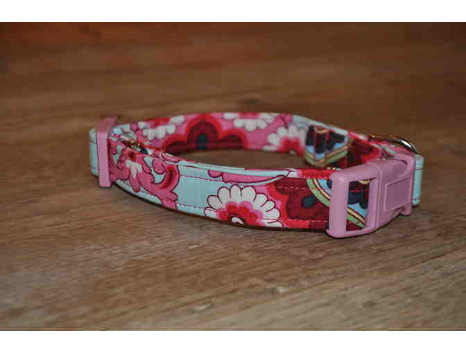 Collar is made out of 100% cotton fabric, interfaced for durability. Triple stitched at all stress points. Buckle is contoured for comfort. Machine wash on delicate and lay to dry. This collar is Medium and fits neck size 12" -19".