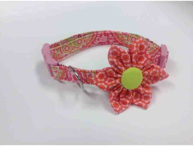 Collar is made out of 100% cotton fabric, interfaced for durability. Triple stitched at all stress points. Buckle is contoured for comfort. Fabric flower is attached with double velcro and is removable. Machine wash on delicae and lay to dry. This collar is Medium and fits neck size 12" -19".