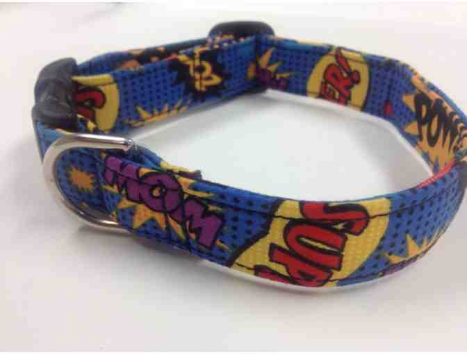 Collar is made out of 100% cotton fabric, interfaced for durability. Triple stitched at all stress points. Buckle is contoured for comfort. Fabric flower is attached with double velcro and is removable. Machine wash on delicae and lay to dry. This collar is Medium and fits neck size 12" -19".