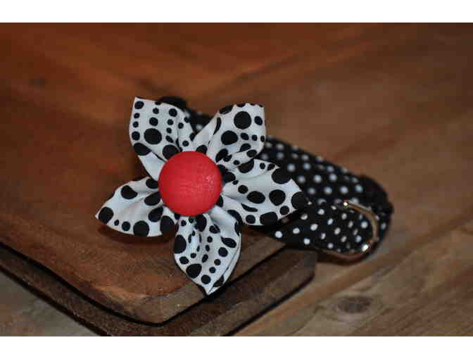 Collar is made out of 100% cotton fabric, interfaced for durability. Triple stitched at all stress points. Buckle is contoured for comfort. Fabric flower is attached with double velcro and is removable. Machine wash on delicae and lay to dry. This collar is Small and fits neck size 10" -15".