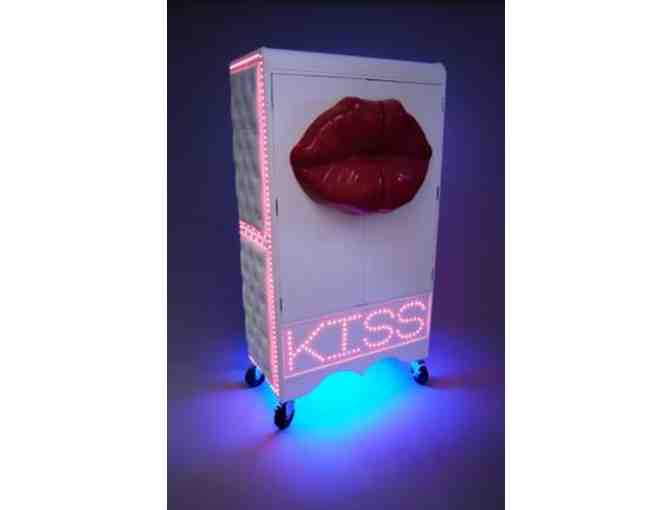 Now refined, the exterior is covered with panels of button-tufted white leather and studded with round red low watt bulbs outlining the frame and spelling out the word “KISS." The doors are hung with chrome barrel hinges, fronted with red latex-covered lips and hidden pulls.
